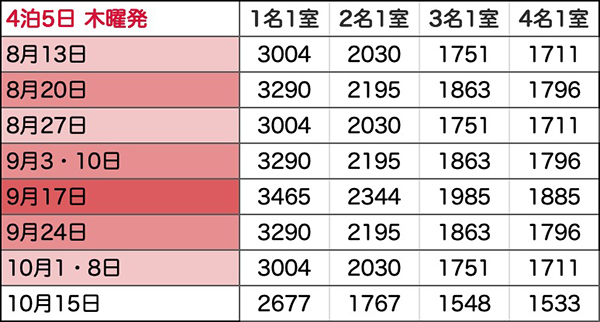 | 月曜発 3泊4日 木曜発 4泊5日 | 含まれるもの |