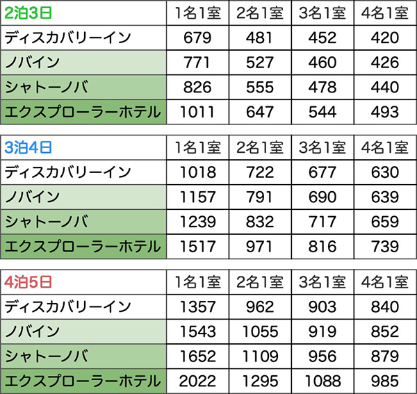 | 2泊3日・3泊4日・4月5日 | 含まれるもの |